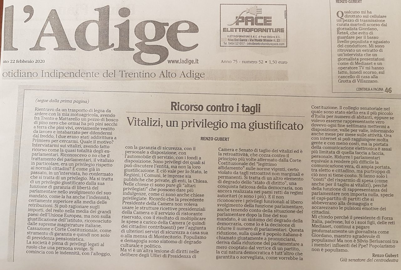 In un articolo sul quotidiano L'Adige (22 febbraio 2020), che pubblichiamo, il sen. Renzo Gubert, rispondendo al conduttore di Mediaset Mario Giordano, svolge una riflessione pacata e meditata sulla nozione di privilegio, intesa come garanzia multidimensionale (vitalizio, indennità, sicurezza, distinzione di ruolo), finalizzato a rendere possibile, in modo "economico" una serie particolare e variegata di funzioni sociali, tra le quali quella parlamentare e rappresentativa. Ecco l'articolo: